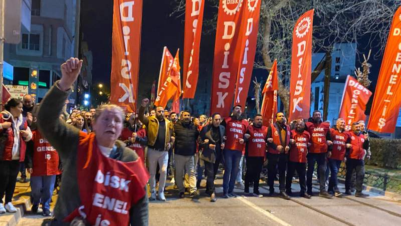 İzmir’de DİSK/Genel-İş yöneticileri, Ekrem İmamoğlu’nun tutuklanması sonrasında düzenlenen eylemlerde atılan sloganlar gerekçe gösterilerek “Erdoğan’a hakaret” suçlamasıyla gözaltına alındı. Genel-İş İzmir 5 No’lu Şube Eğitim Sekreteri Olcay Çalık, Konak MERBEL işyeri temsilcisi Tolga Irmak ve 3 No’lu Şube Örgütlenme Sekreteri Serhan Demirtaş hakkında savcılık tarafından soruşturma başlatıldı.
