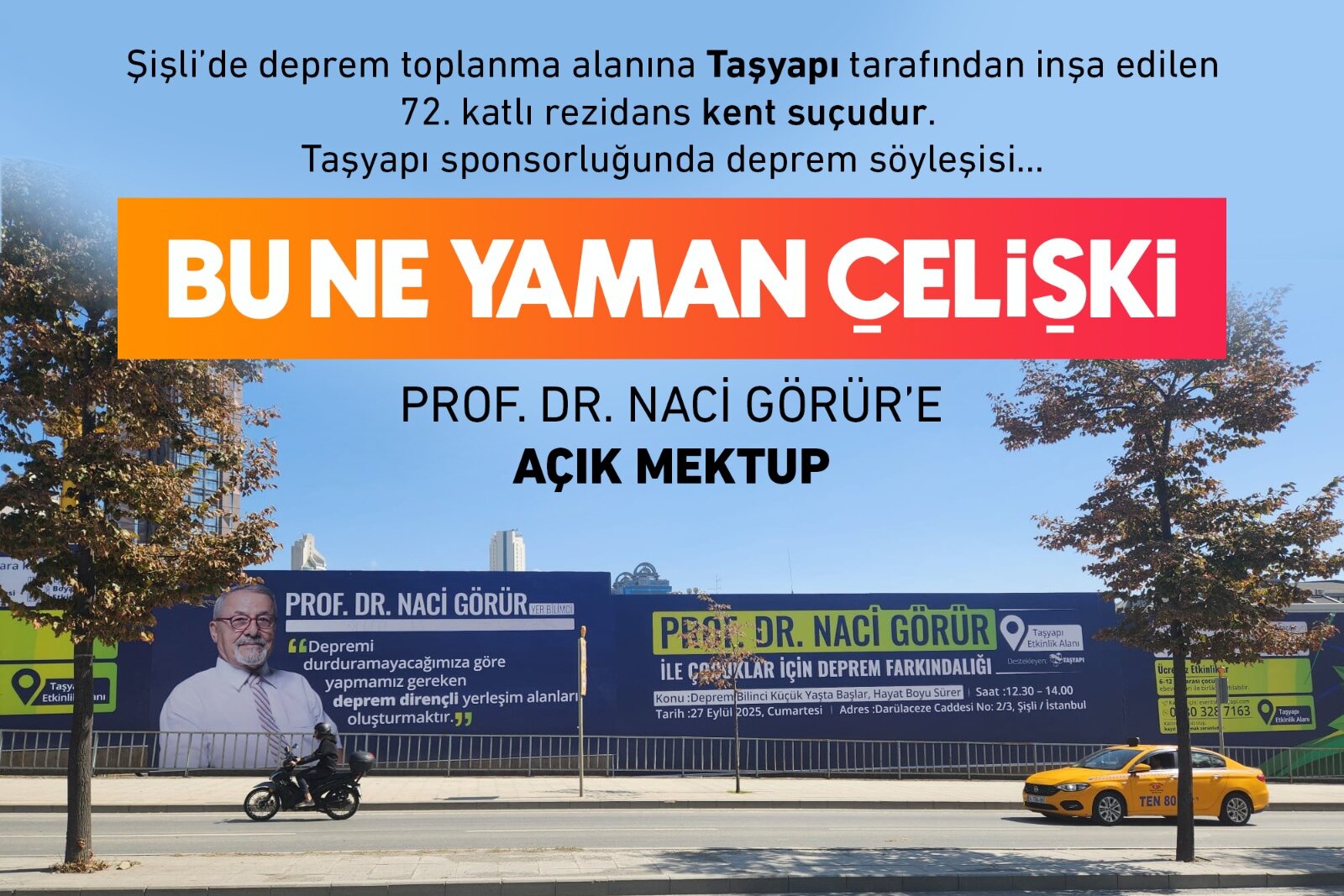 “Dertleşi” adı ile yayınladığınız açıklamada derdinizin sadece çocukları deprem konusunda eğitmek olduğundan bahsediyorsunuz. Çocukların yeşil alanlarını, afet toplanma alanlarını gasp eden, Şişli’nin yıllardır trafiğini, çevre güvenliğini felç eden Taş Yapı ile etkinlik gerçekleştirmek suça ortak olmak demek değil de nedir? Depremi genç nesillerle yenmek istiyorsak, önce kent suçlarına karşı tavizsiz durmak gerekir. Çünkü deprem bilinci sadece eğitimle değil, aynı zamanda kamusal alanların korunmasıyla mümkündür. 23 Nisan günü yaşanan depremde deprem toplanma alanı diye koca bir şantiye ile karşılaşmış olan çocuklara acaba ne cevap vereceksiniz?