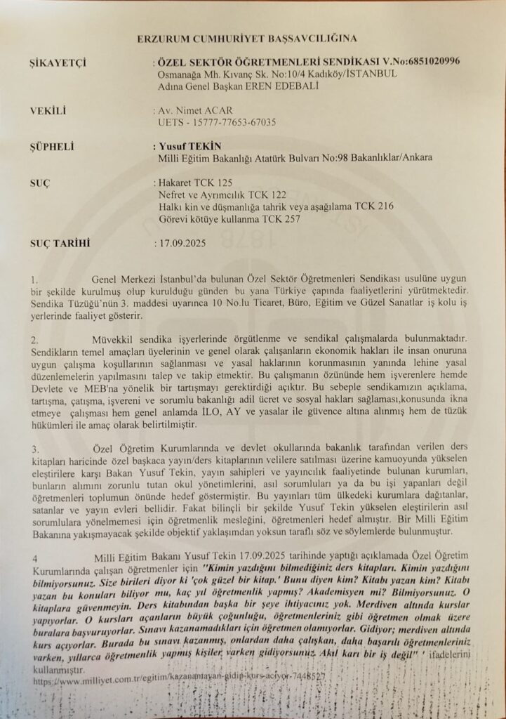 Öğretmen Sendikası’nın Erzurum Cumhuriyet Başsavcılığına yaptığı suç duyursunda “Hakaret”, “Nefret ve ayrımcılık”, “Halkı kin ve düşmanlığa tahrik veya aşağılama” ve “Görevi kötüye kullanma” maddelerinden şikayetçi oldu.
