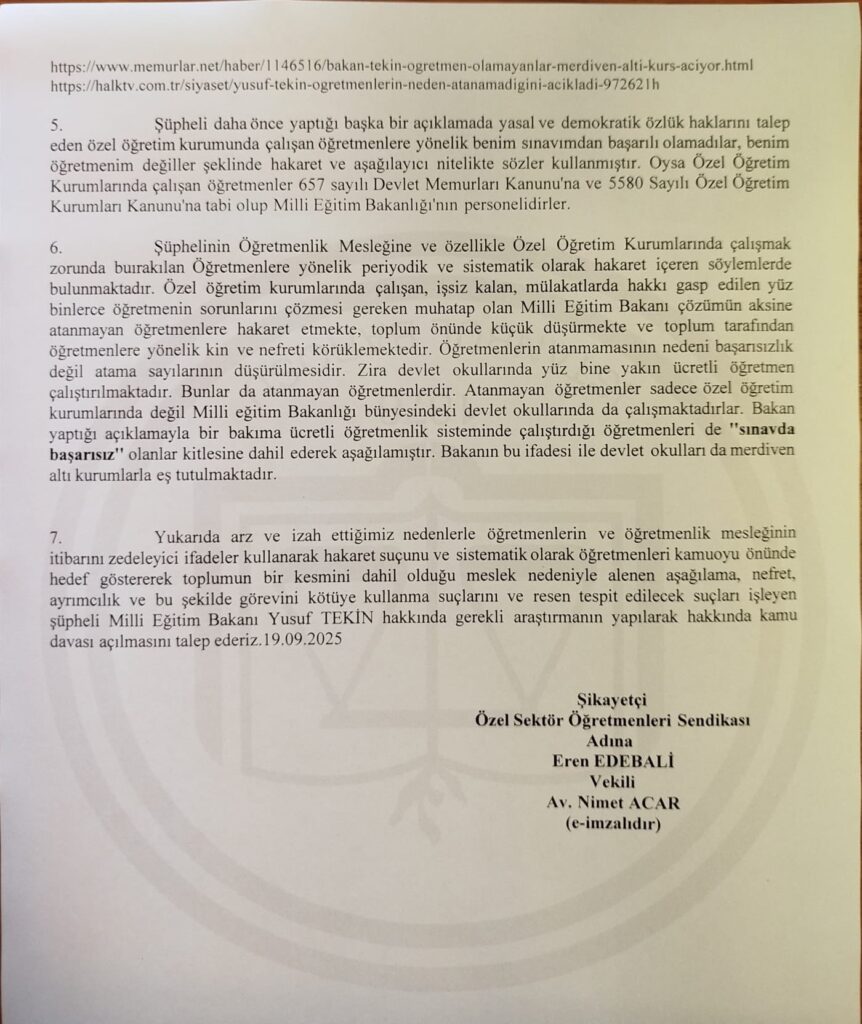Öğretmen Sendikası, Milli Eğitim Bakanı Yusuf Tekin’in özel sektör öğretmenlerini ayrıştıran ve aşağılayan “Sınavı kazanamadıkları için öğretmen olamıyorlar. Gidiyorlar; merdiven altında kurs açıyorlar. Burada bu sınavı kazanmış onlardan daha çalışkan, daha başarılı öğretmenleriniz varken, yıllarca öğretmenlik yapmış kişiler varken gidiyorsunuz. Akıl karı bir iş değil” sözlerinden suç duyurusunda bulundu