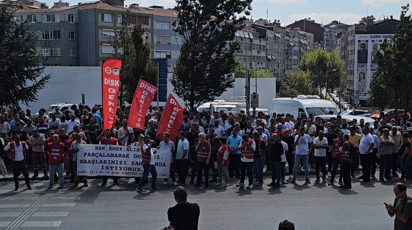 Şişli Belediyesi işçileri haziran ayından beri ikramiyelerin de içinde olduğu yan haklar ve mesai ücretlerini alamadıkları için belediye önünde eylem yaptı. DİSK/Genel-İş İstanbul 3 No’lu Şube Başkanı Zeynel Yiğit uyarı mahiyetinde bu eylemi yaptıklarını söyledi. İşçilere hafta sonu mesailerine gitmeme çağrısı yaptıklarını söyleyen Yiğit, sorun çözülmezse 9 Eylül Salı günü tam gün iş bırakacaklarını ekledi