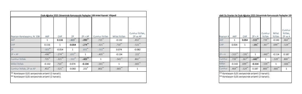 2025 Ocak-Ağustos döneminde kamuoyuyla paylaşılmış anket sonuçları da bu kanıyı destekliyor. Genişletilmiş Cumhur İttifakı’nın tahmini oy oranı Genişletilmiş Millet İttifakı’nınkiyle başa baş bir seyir izliyor. Her iki oy öbeği de bu dönemde kamuoyuyla paylaşılan 108 anketin yalnızca (yaklaşık) beşte birinde yüzde 50’nin üstünde bir orana erişebilmiş ve her iki öbek için de yukarı yönlü bir trendden bahsedemeyiz.