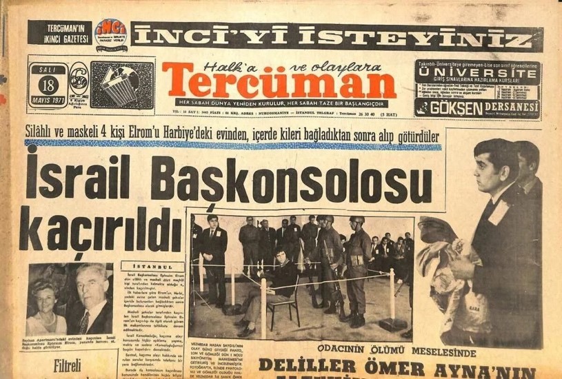 18 Mayıs 1971 Tercüman Gazetesi manşeti, İsrail Başkonsolosu Efraim Elrom’un İstanbul’da Mahir Çayan, Ulaş Bardakçı ve Hüseyin Cevahir tarafından kaçırılışını duyuruyor.