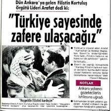 Filistin Kurtuluş Örgütü lideri Yaser Arafat’ın Ankara ziyareti sonrası Bülent Ecevit’le birlikte görüntüsü bulunan gazete manşeti.