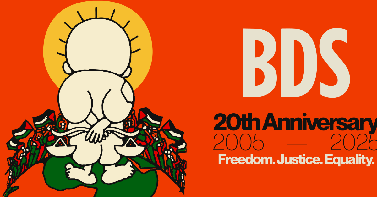 BDS Hareketi’nin 20. yılı (2005–2025) için hazırlanan afişte, Filistinli karikatürist Naji al-Ali’nin simgesel karakteri Hanzala kullanılmıştır.