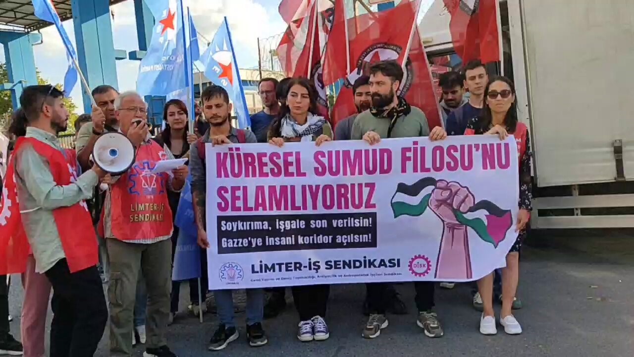 Limter-İş Sendikası üyeleri, Gazze’ye yönelik Küresel Sumud Filosu’na destek eyleminde.