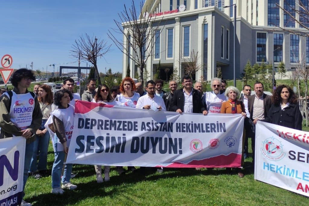 Depremzede asistan hekimler eğitim hakları için Sağlık Bakanlığı önünde: “Şartsız olarak güvenli bölgelere geçişimiz sağlanmalı”