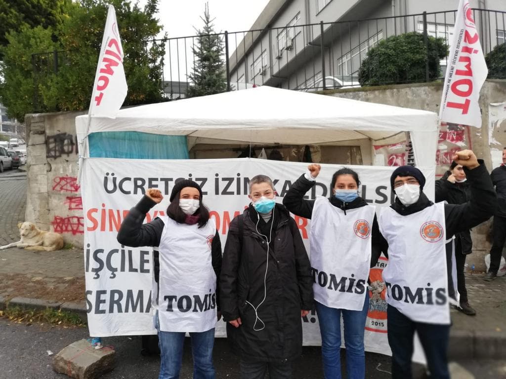 DİSK Genel Başkanı Arzu Çerkezoğlu ile yönetim kurulu üyelerinden direnişte 100. gününü dolduran K. T. Deri Fabrikası işçilerine ziyaret